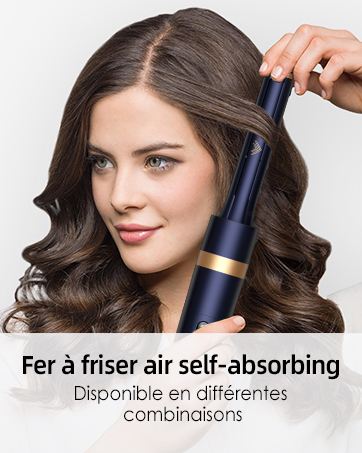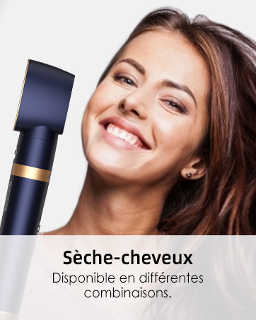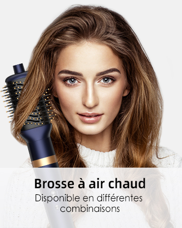 L’ensemble comprend 6 accessoires dont 4 fers à friser de différents diamètres, une brosse volumatrice et un sèche-cheveux principal.