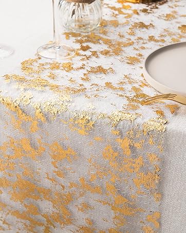 2 rouleaux de chemin de table avec des flocons de feuille d’or brillant.