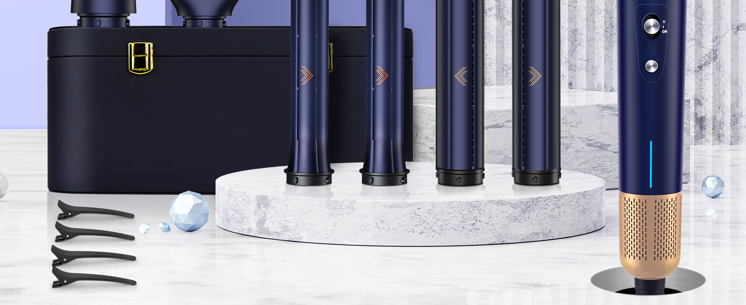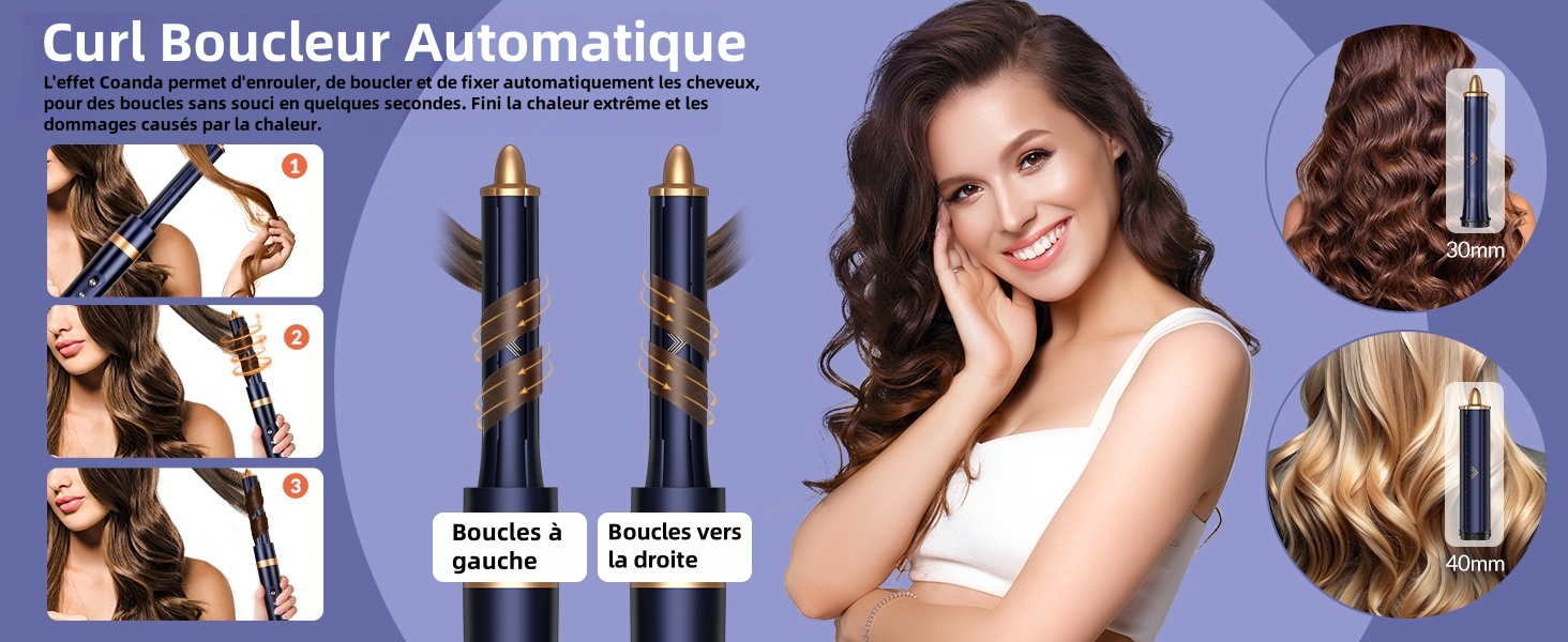 L’ensemble comprend 6 accessoires dont 4 fers à friser de différents diamètres, une brosse volumatrice et un sèche-cheveux principal.