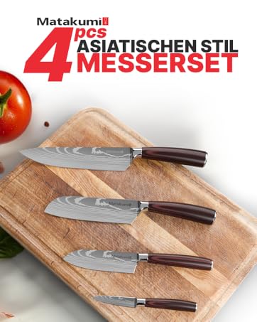 Matakumi - Set cuisine japonais, 4 pièces, acier carbone, poignée ergonomique, motif damassé gravé