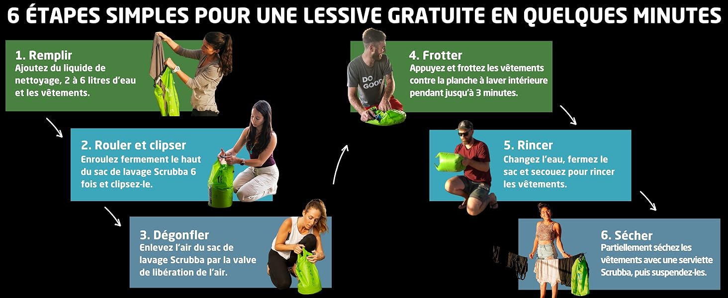 Le sac de lavage Scrubba est le seul qui soit réellement pratique à emporter sur le terrain ou en voyage. La conception de la planche à laver intégrée au sac permet de plier celui-ci au format poche. Il ne pèse alors que 150-160 g : parfait pour ceux qui voyagent légers. Il est deux fois plus efficace que le lavage à la main et beaucoup plus hygiénique qu'un évier commun. De plus, avec le sac Scrubba, vous pouvez laver vos vêtements n'importe où, n'importe quand et en quelques minutes seulement.